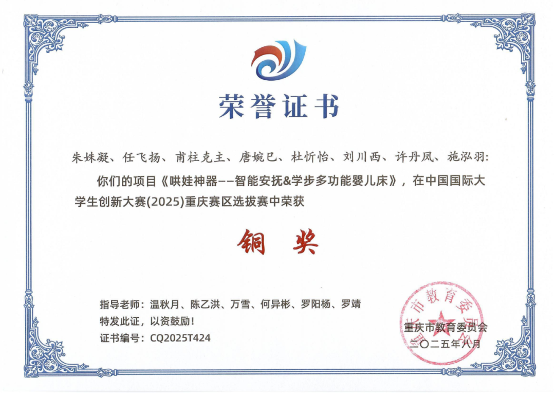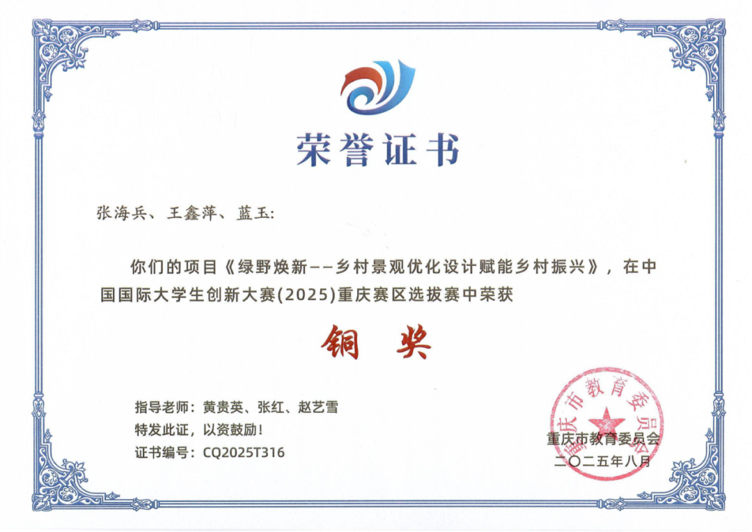 中国国际大学生创新大赛(2025)重庆赛区选拔赛决赛在重庆医科大学落下帷幕。我校参赛团队经过激烈比拼,我校学生朱姝凝、任飞扬、甫柱克主、唐婉巳、杜忻怡、刘川西、许丹凤、施泓羽(指导老师:温秋月、陈乙洪、万雪、罗阳杨、罗靖)团队和学生张海兵、王鑫萍、蓝玉(指导老师:黄贵英、张红、赵艺雪)团队成功斩获2项铜奖,在实现获奖突破的同时,数量上也取得新进展。