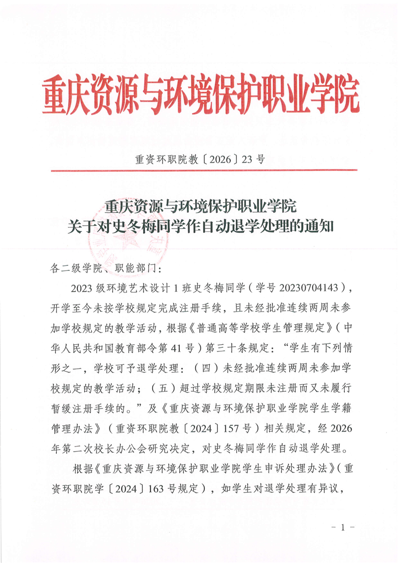 关于对史冬梅同学作自动退学处理的通知