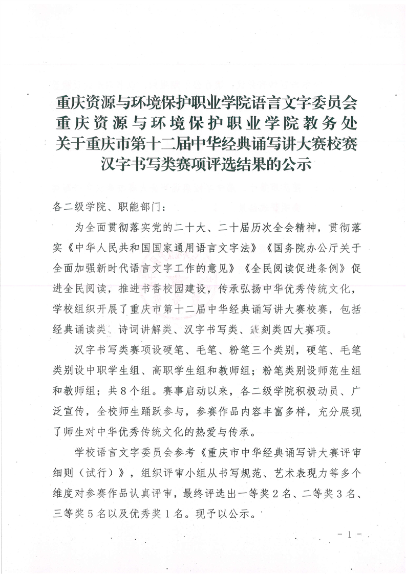 关于重庆市第十二届中华经典诵写讲大赛校赛汉字书写类赛项评选结果的公示
