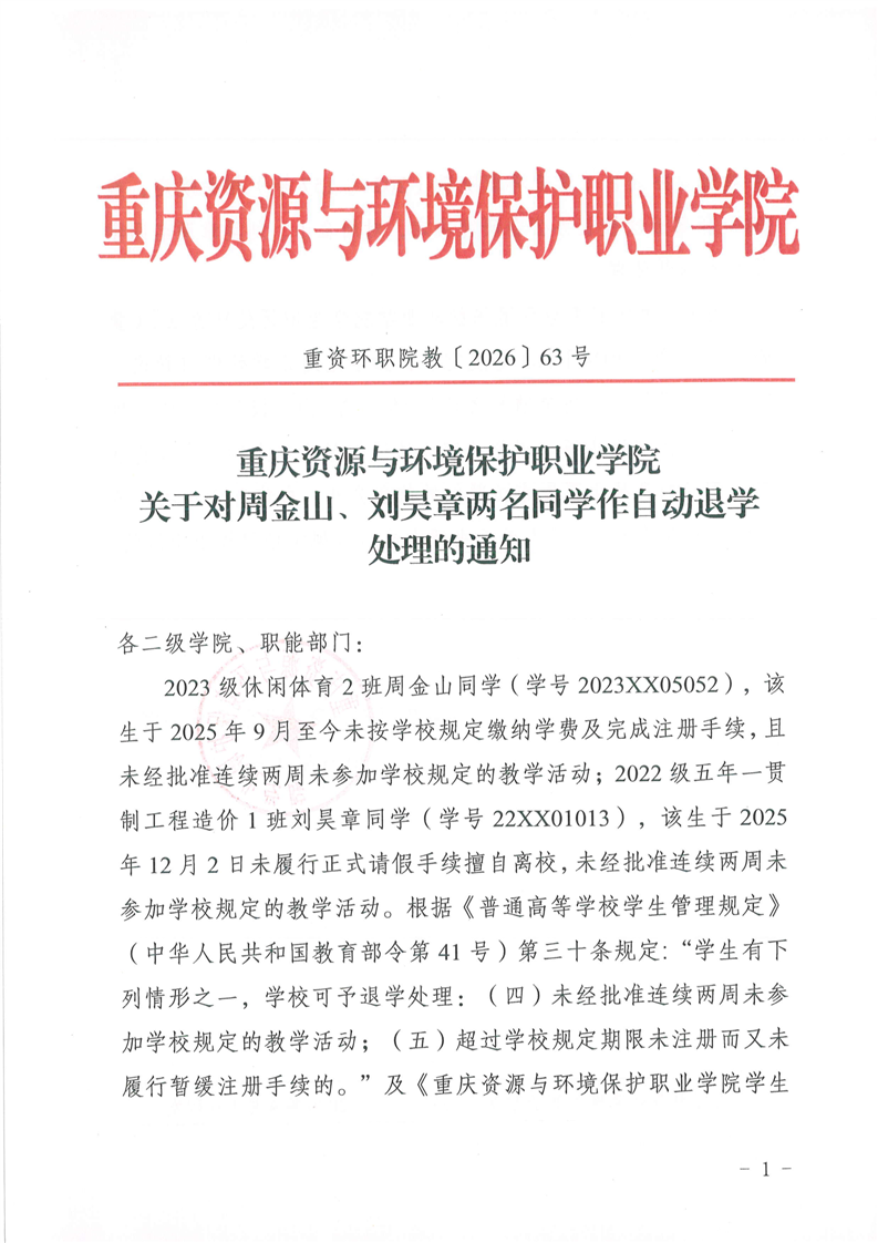 关于对周金山、刘昊章两名同学作自动退学处理的通知