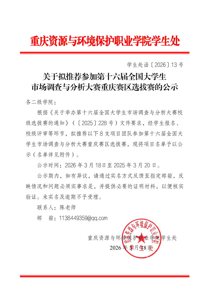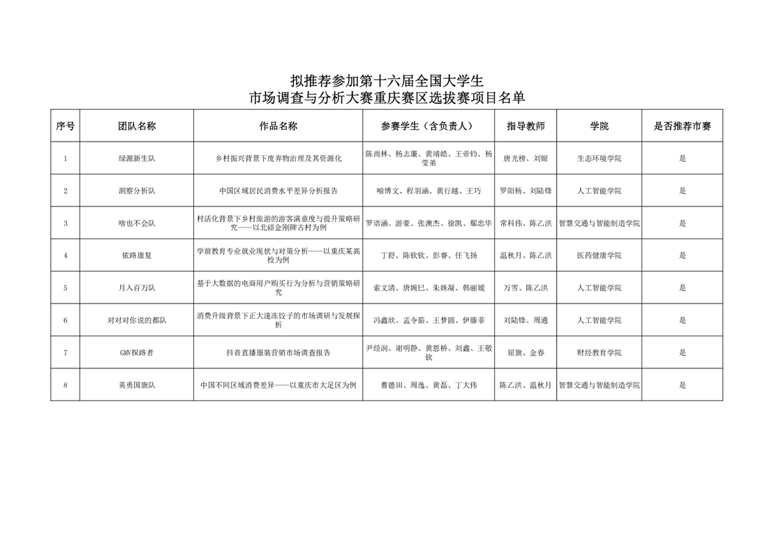 关于拟推荐参加第十六届全国大学生市场调查与分析大赛重庆赛区选拔赛的公示