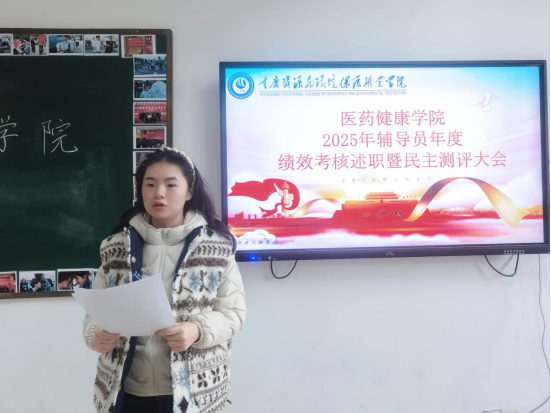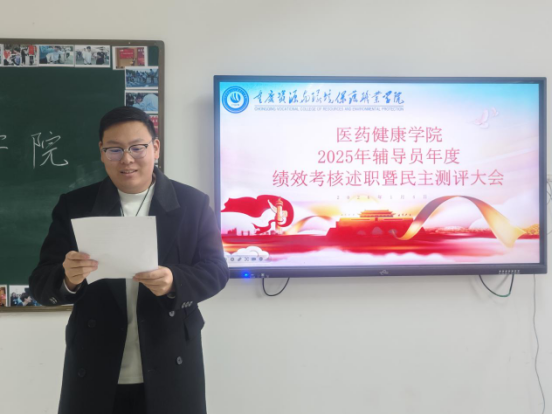 2026年1月4日上午,重庆资源与环境保护职业学院医药健康学院召开2025年辅导员年度考核述职暨民主测评会。全体专职辅导员参加了会议。辅导员按照抽签顺序依次上台,围绕“立德树人、多元育人、日常管理、工作实绩、“成果展示”等方面述职。以饱满的热情和详实的内容全面呈现了个人在2025年度完成的学生工作。