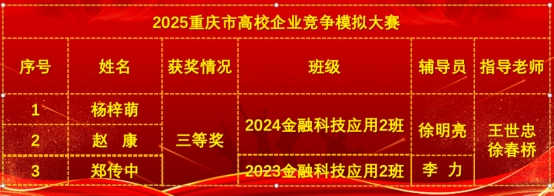 2025年重庆市高校企业竞争模拟大赛总决赛在西南政法大学隆重举行。大赛由重庆市教育委员会主办,西南政法大学承办,中国管理现代化研究会决策模拟专业委员会协办。历经初赛、复赛的激烈角逐,我院金融科技应用专业参赛队伍凭借扎实的专业技能、敏锐的市场洞察能力和出色的团队协作,一路披荆斩棘,最终脱颖而出,取得高职组三等奖1项。
