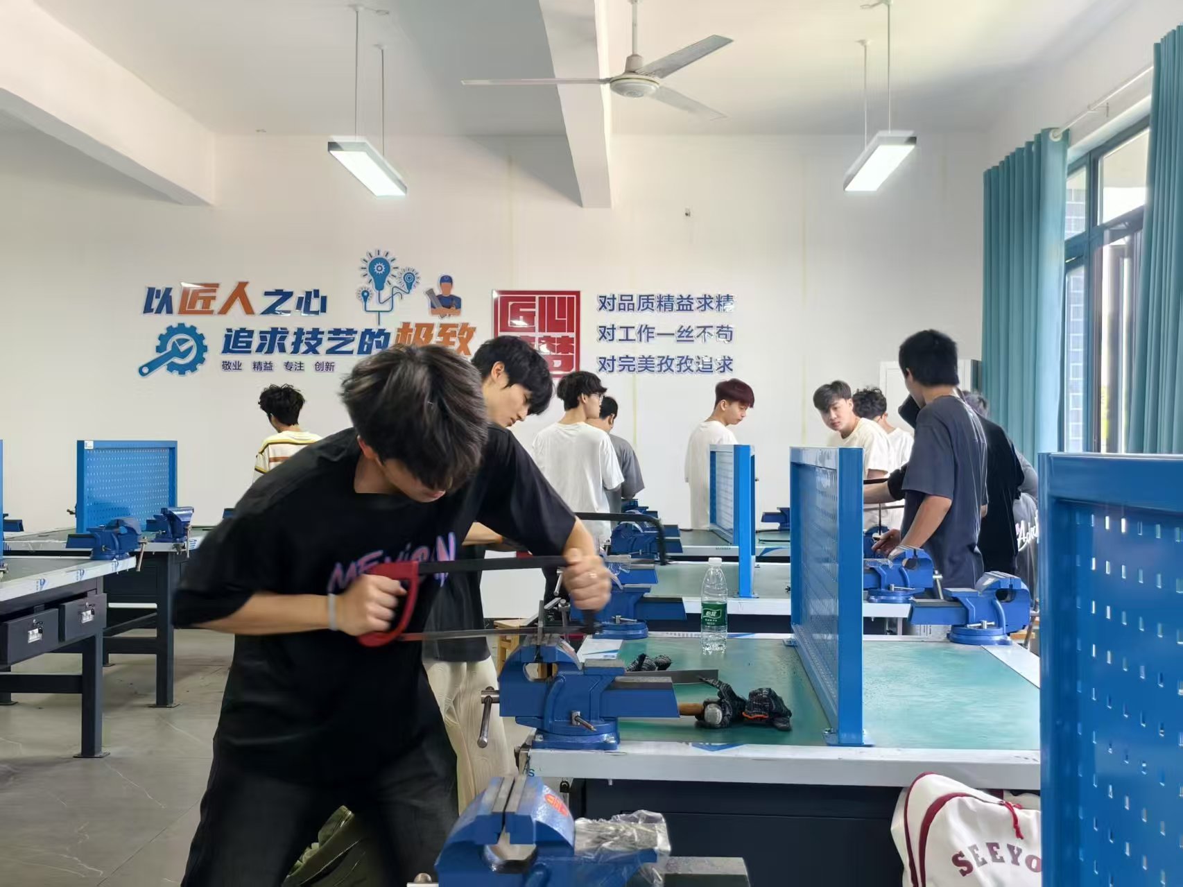 钳工实训室是学院机械类专业基础实训室之一,主要面向机械制造、电气自动化、数控技术、汽车制造、工业工程、设备维修等专业学生的实训。钳工实训是所有机电类专业的基础实习课程。