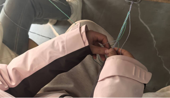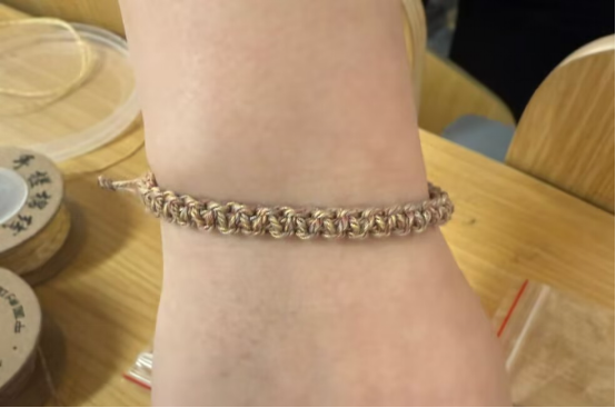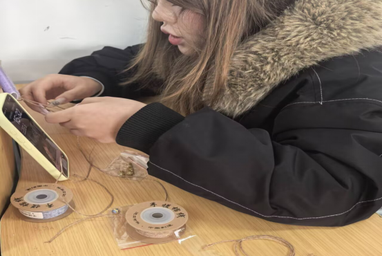 在轻松愉快的氛围中,活动正式拉开帷幕。学院特邀手工达人进行现场教学,从平结、玉米结等基础编法,到如何巧妙融入装饰配件,每一步都耐心讲解、细致示范。同学们或几人一组,或围坐一圈,边学边做、互相交流协助。手指穿梭间,彩绳渐渐成结,笑语声中交织着专注与协作的温度。不少同学在完成作品后,将亲手编织的手绳、手机链等赠予好友或家人,让小小手作物成为连接情感的纽带。