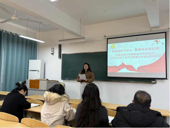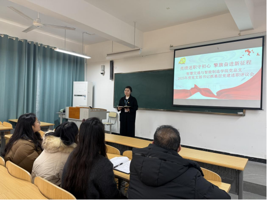 2026年1月7日16:40,智慧交通与智能制造学院党总支在XJ408教室召开2025年度党支部书记抓基层党建述职评议会。会议以“亮绩述职守初心 擎旗奋进新征程”为主题,全面盘点各党支部2025年党建工作成效,深入剖析问题不足,明确2026年党建工作方向。