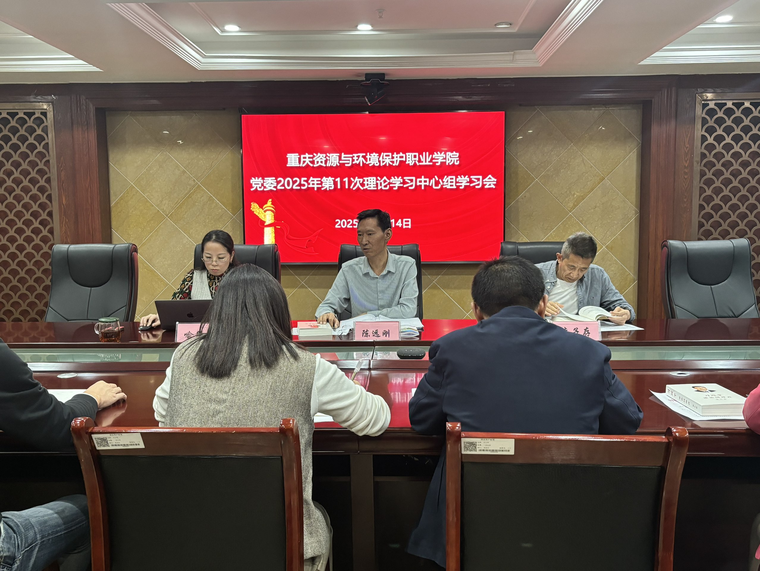 10月14日下午,校党委在办公楼三楼会议室召开党委理论学习中心组2025年第11次集中学习会议。会议主要学习了《习近平谈治国理政》第五卷和《中国共产党思想政治工作条例》的相关内容。校领导、党委委员、二级学院党总支书记参加学习,党委书记陈远刚主持并总结。