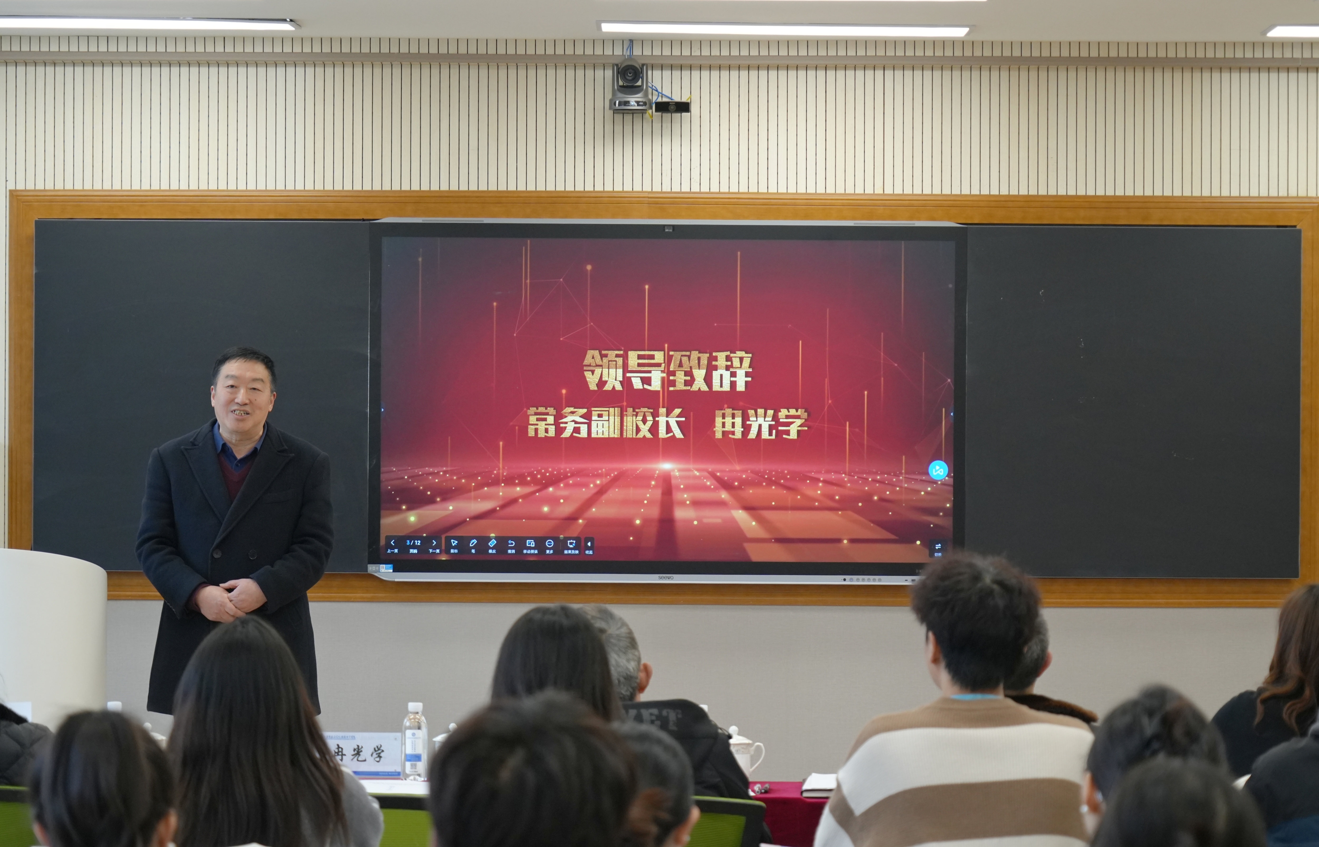 常务副校长冉光学教授在致辞中强调,学校已迈入新的发展阶段,教育教学改革是推动学校高质量发展的核心动力。本次说课比赛作为提升教师教学能力的重要平台,不仅是对教师专业素养的检验,更是促进教学经验交流、推动课程创新的重要契机。希望以此次教师说课程为契机,逐步开展专业带头人说专业、院长说学院建设、校长说办学等活动,形成多层次、全方位的教学交流与提升体系,助力学校教育教学质量再上新台阶。