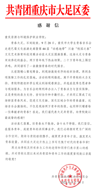 近日,我校收到共青团重庆市大足区委员会发来的一封热情洋溢的感谢信,对我校参与重庆市大学生青春音乐会走进巴蜀文化旅游走廊暨第44届“动感地带”川渝“校园之春”文化艺术体育科技闭幕活动工作表示感谢。这不仅是一次成功的校地协同实践,更是对我校参与区域共青团事业的鼓励与认可!未来,学校将继续秉持开放合作的理念,积极参与共青团事业发展,深入关注青少年成长情况,为青年学生成长成才搭建更广阔的舞台,为地方经济