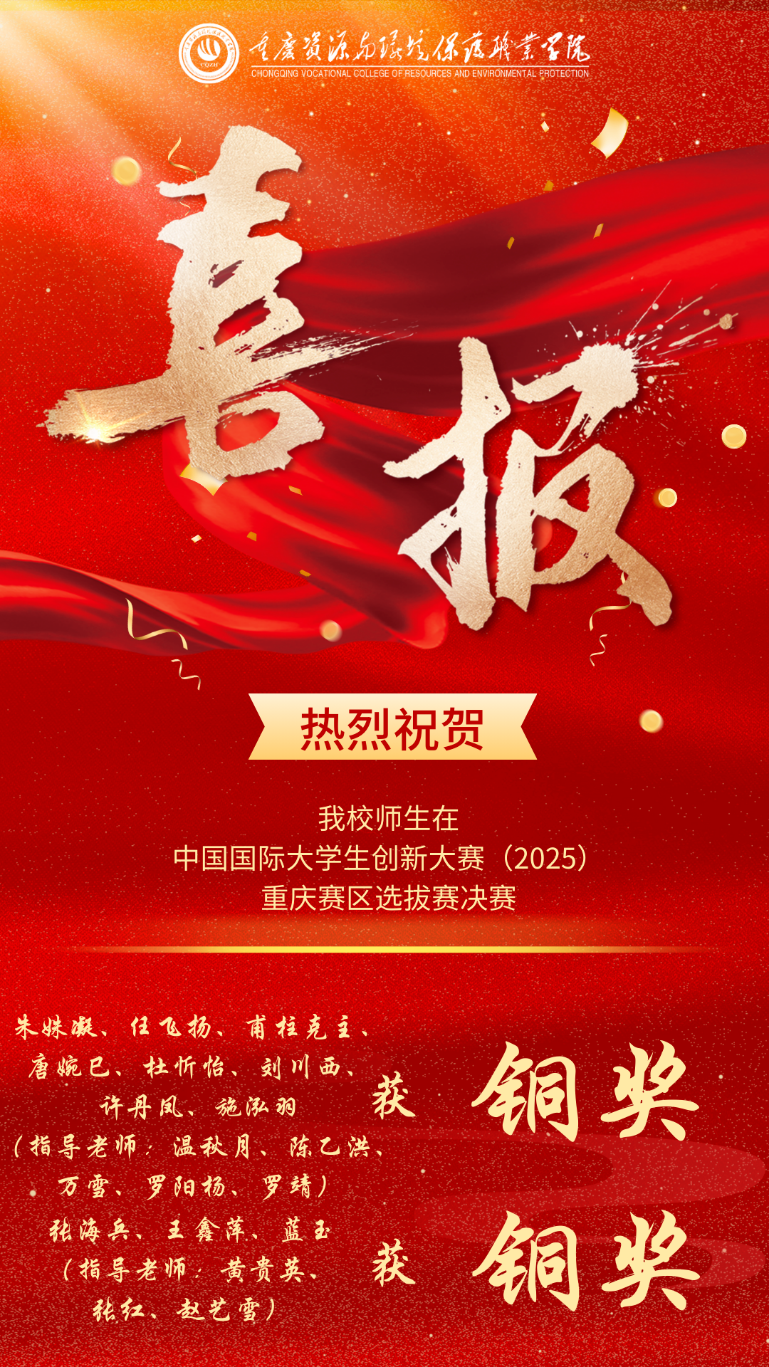 中国国际大学生创新大赛(2025)重庆赛区选拔赛决赛在重庆医科大学落下帷幕。我校参赛团队经过激烈比拼,我校学生朱姝凝、任飞扬、甫柱克主、唐婉巳、杜忻怡、刘川西、许丹凤、施泓羽(指导老师:温秋月、陈乙洪、万雪、罗阳杨、罗靖)团队和学生张海兵、王鑫萍、蓝玉(指导老师:黄贵英、张红、赵艺雪)团队成功斩获2项铜奖,在实现获奖突破的同时,数量上也取得新进展。