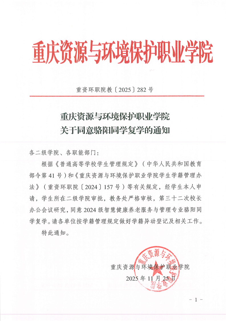 关于同意骆阳同学复学的通知