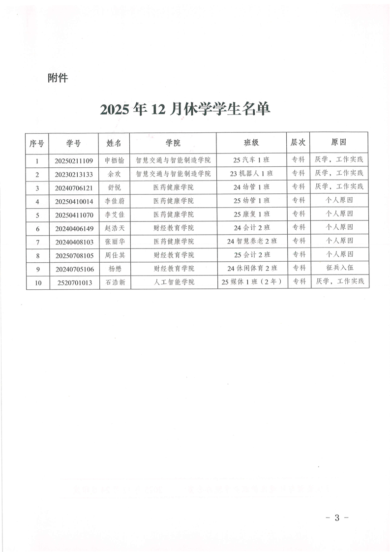 关于同意申栖榆等10名同学休学的通知