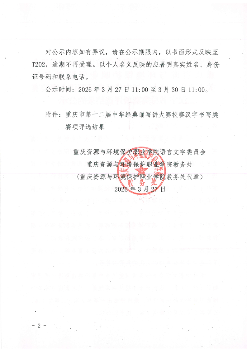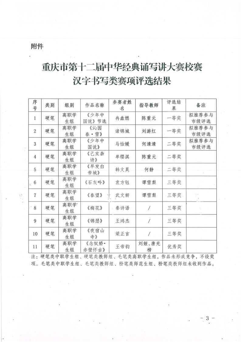 关于重庆市第十二届中华经典诵写讲大赛校赛汉字书写类赛项评选结果的公示
