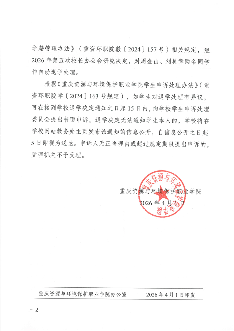 关于对周金山、刘昊章两名同学作自动退学处理的通知