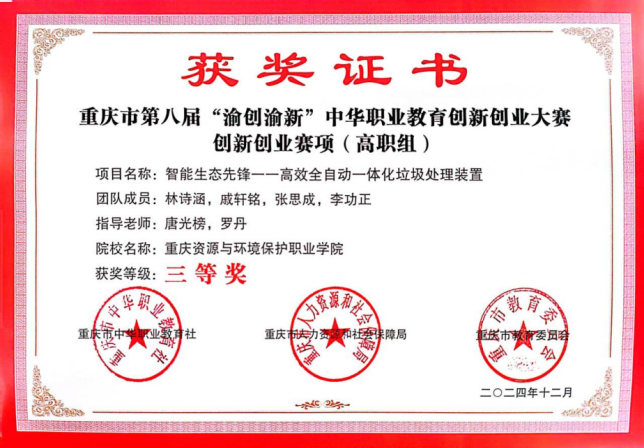 创新赋能,实干筑梦!近日,重庆市第八届“渝创渝新”中华职业教育创新创业大赛创新创业赛项(高职组)落下帷幕。我校以“智能生态先锋——高效全自动一体化垃圾处理装置”为参赛项目的团队,凭借前瞻性的创新理念、扎实的技术支撑与完善的落地规划,在众多优秀项目中崭露头角,成功斩获重庆市三等奖,为学校创新创业教育成果再添闪亮一笔!