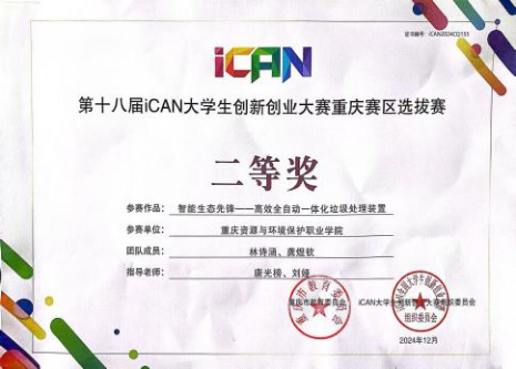 第十八届iCAN大学生创新创业大赛重庆赛区选拔赛圆满落幕。我校参赛团队在激烈角逐中表现亮眼,我院23级环境监测技术专业学生林诗涵、龚煜钦(指导老师:唐光榜、刘娅)凭借扎实的专业功底、敏锐的创新思维与高效的团队协作,从众多参赛队伍中脱颖而出,成功斩获大赛二等奖,为我校在创新创业赛事中再添荣誉。
