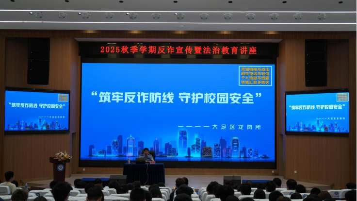 2025年9月9日下午,阳光洒满校园,大足区协调机制办与龙岗派出所民警走进我校,开展了一场极具意义的电信网络反诈宣传及法制教育讲座,为师生们带来了丰富的安全知识盛宴。讲座伊始,民警龙兴播放了一系列精心制作的反诈视频,以真实案例为蓝本,生动还原了“网络兼职刷单”“冒充公检法诈骗”“网络游戏虚假交易”等常见电信网络诈骗场景。一桩桩触目惊心的案例,让师生们深刻认识到诈骗手段的多样性与隐蔽性。随后,民