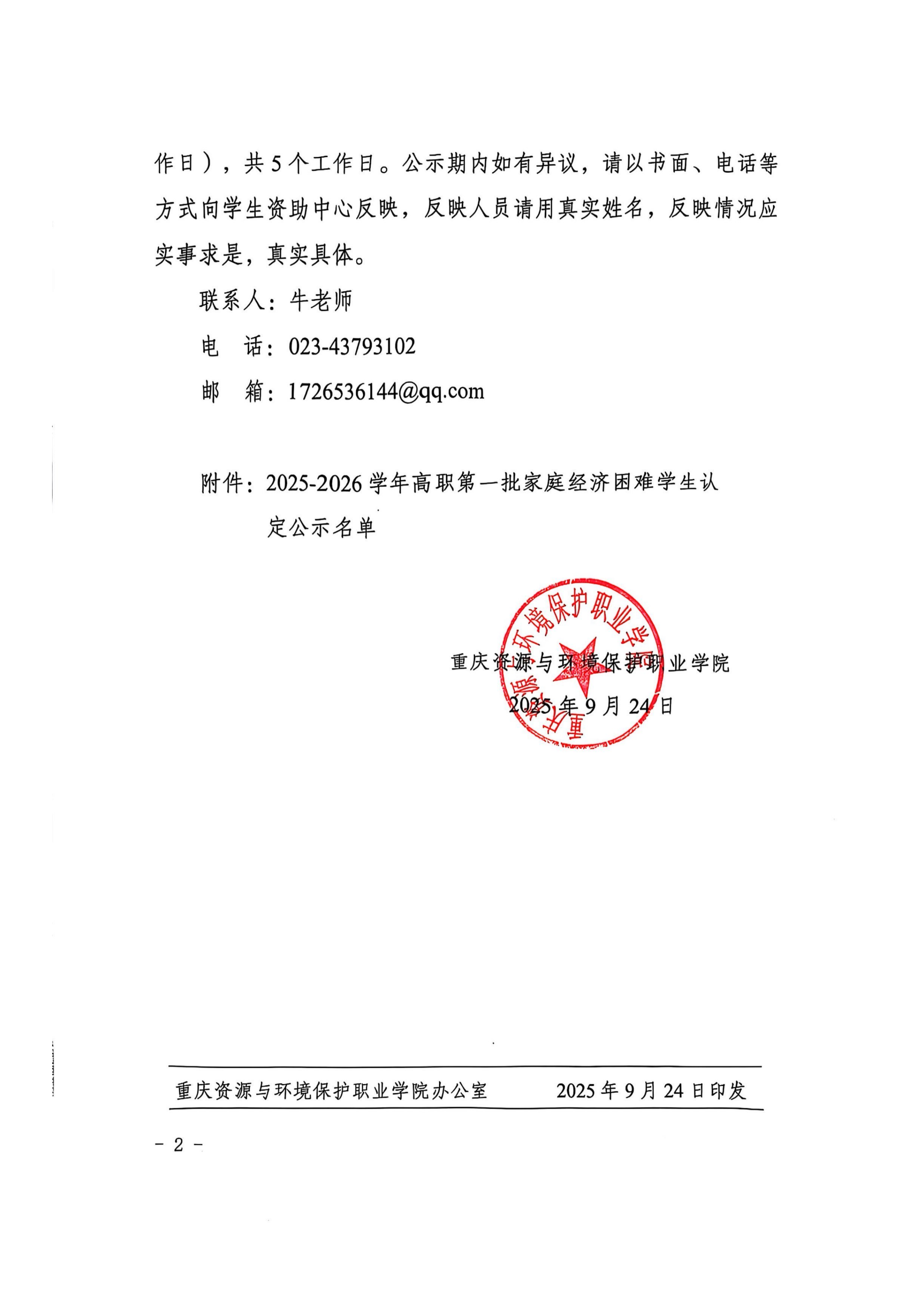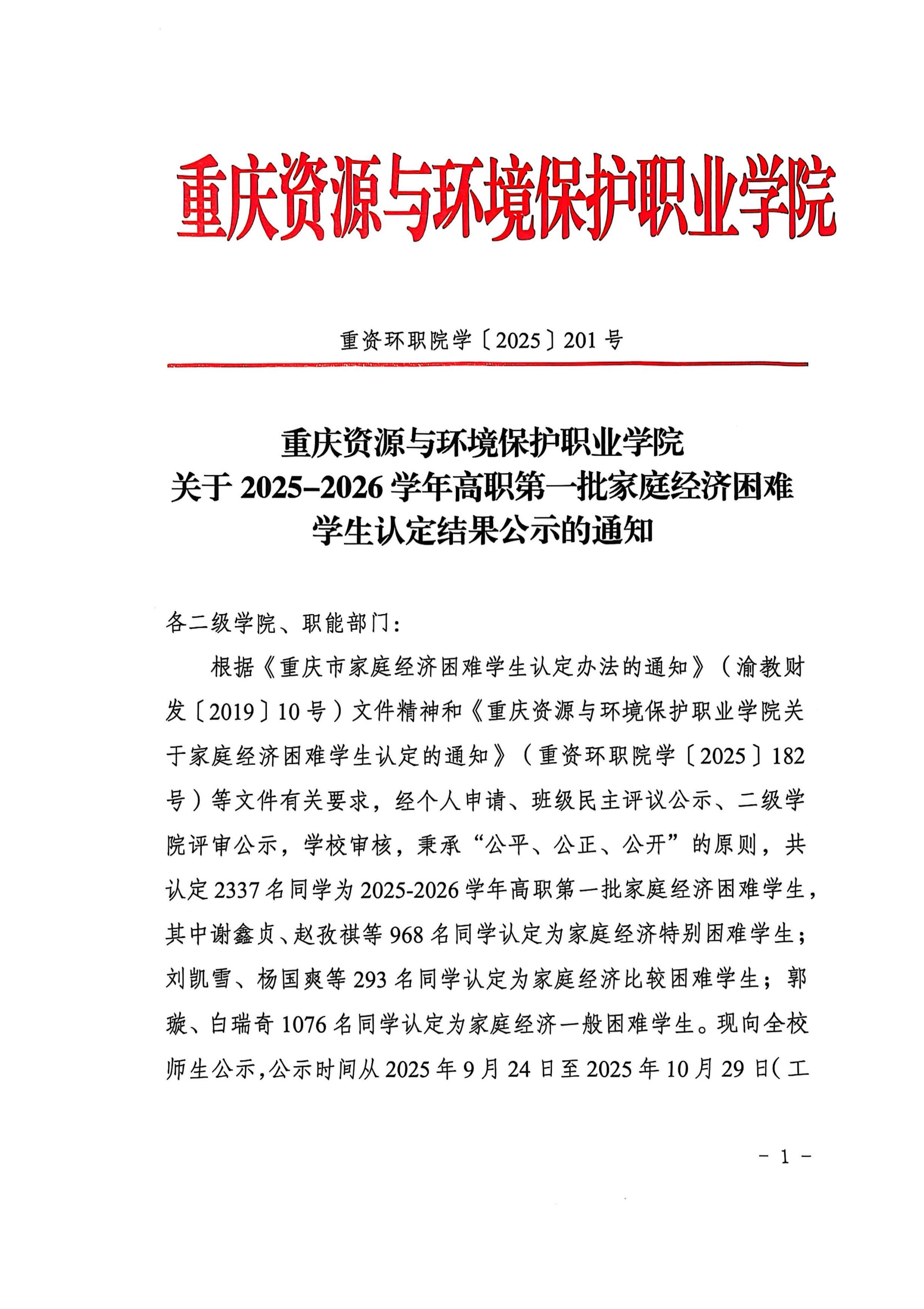 重资环职院〔2024〕218号2024-2025学年高职家庭经济困难学生认定结果公示