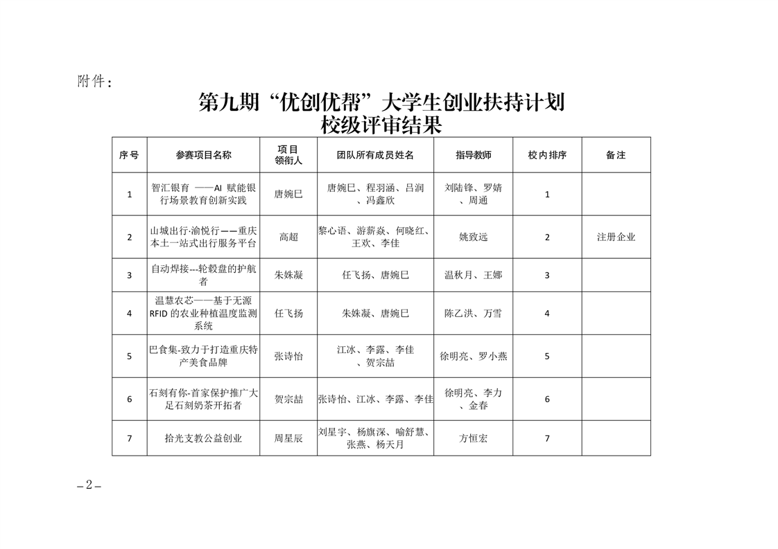 重庆资源与环境保护职业学院关于第九期“优创优帮”大学生创业扶持计划校级评审结果的公示