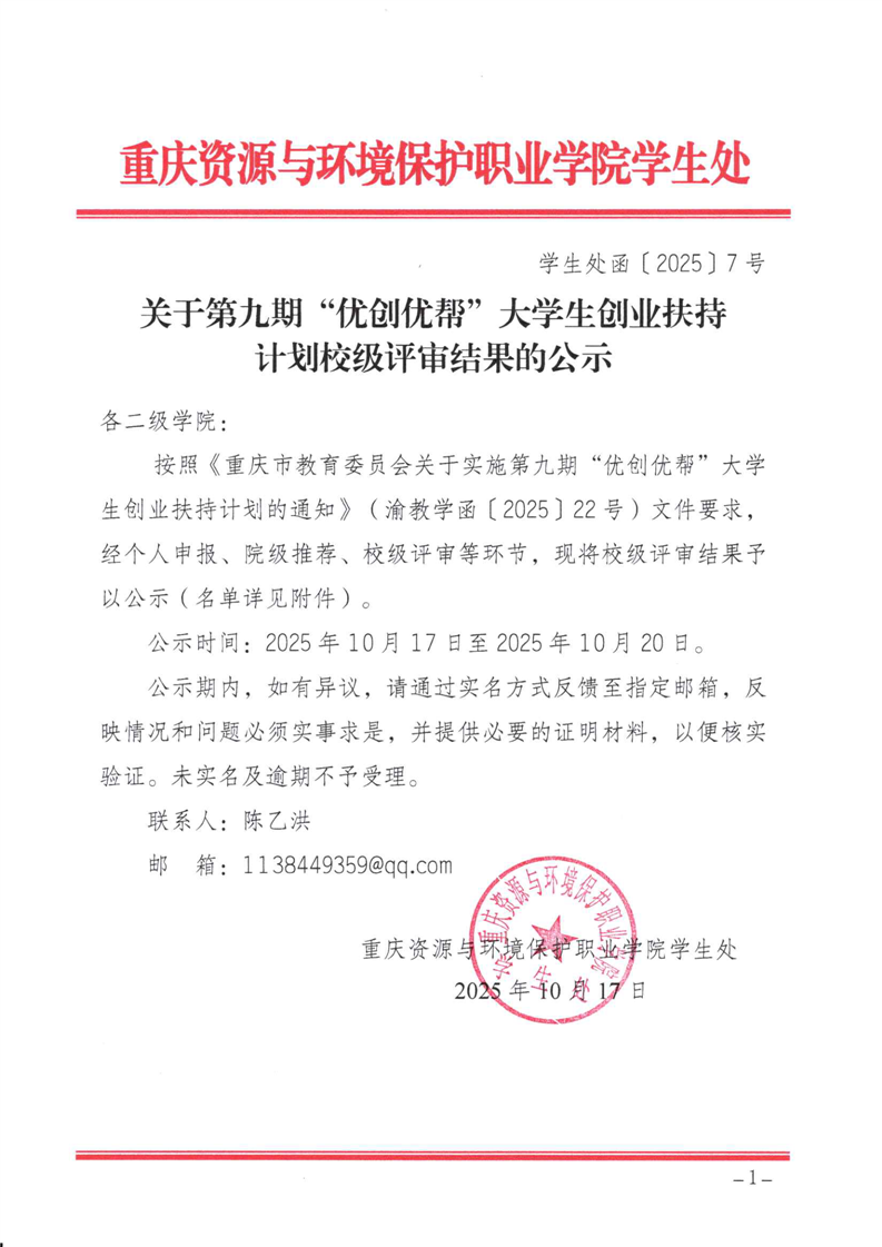 上一篇:重庆资源与环境保护职业学院关于拟推荐参加2025年iCAN大学生创新创业大赛创新赛道重庆赛区选拔赛项目名单的公示