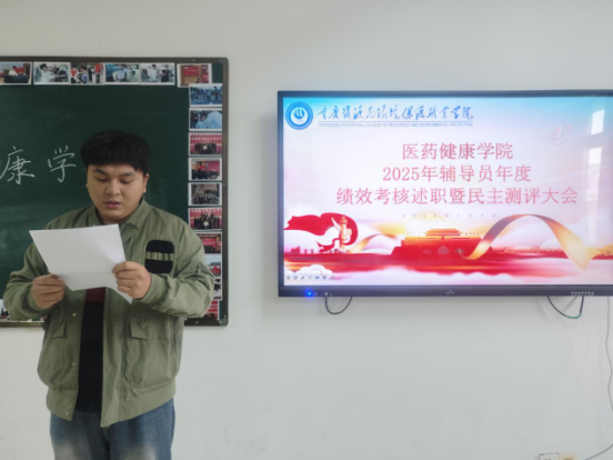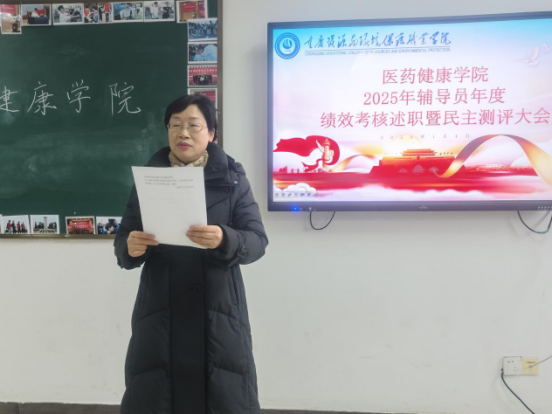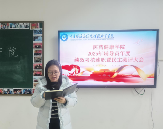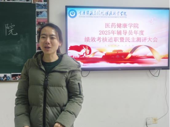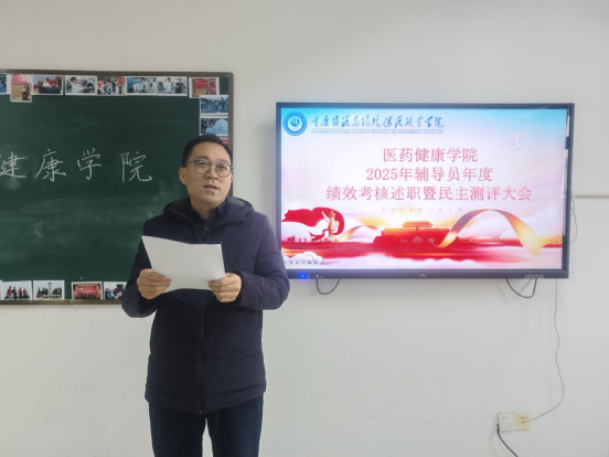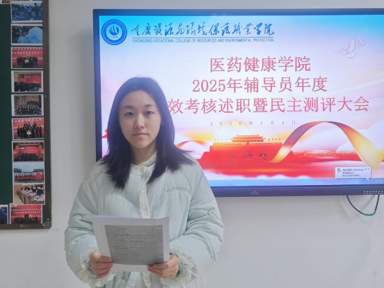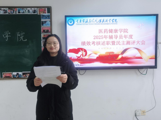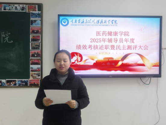 2026年1月4日上午,重庆资源与环境保护职业学院医药健康学院召开2025年辅导员年度考核述职暨民主测评会。全体专职辅导员参加了会议。辅导员按照抽签顺序依次上台,围绕“立德树人、多元育人、日常管理、工作实绩、“成果展示”等方面述职。以饱满的热情和详实的内容全面呈现了个人在2025年度完成的学生工作。