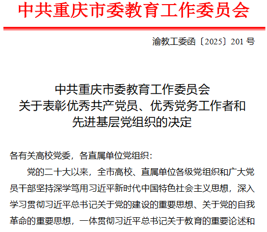 近日,中共重庆市委教育工作委员会印发《关于表彰优秀共产党员、优秀党务工作者和先进基层党组织的决定》,财经教育学院教师第二支部在服务保障中心工作中发挥了战斗堡垒作用,被评为市级“先进基层党组织”。