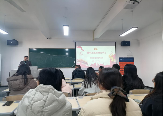 为深入学习贯彻党的二十届四中全会精神,推动习近平新时代中国特色社会主义思想入脑入心,财经教育学院于2025年11月28日在XS509举行2025年11月份教职工政治理论学习,会议紧扣政治学习主线,同步总结复盘近期工作、部署推进重点任务,会议由副院长谢元亭主持,学院全体教职工参会。
