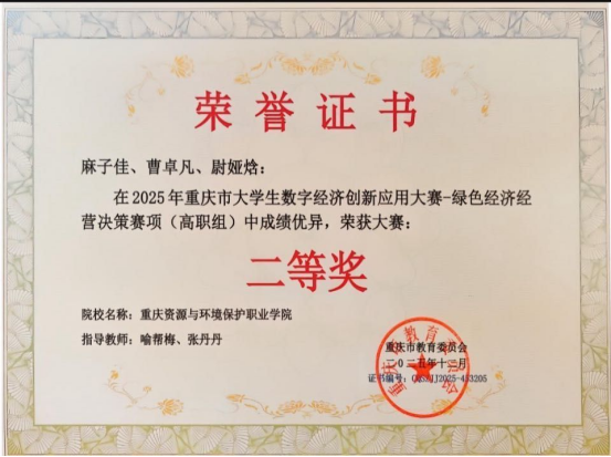 在近期由重庆市教育委员会主办的2025年重庆市大学生数字经济创新应用大赛中,我校师生表现突出,凭借扎实的专业功底和卓越的实践能力,一举夺得高职组二等奖两项,充分展现了我校在人才培养方面取得的显著成效和师生积极向上、勇于创新的精神风采。